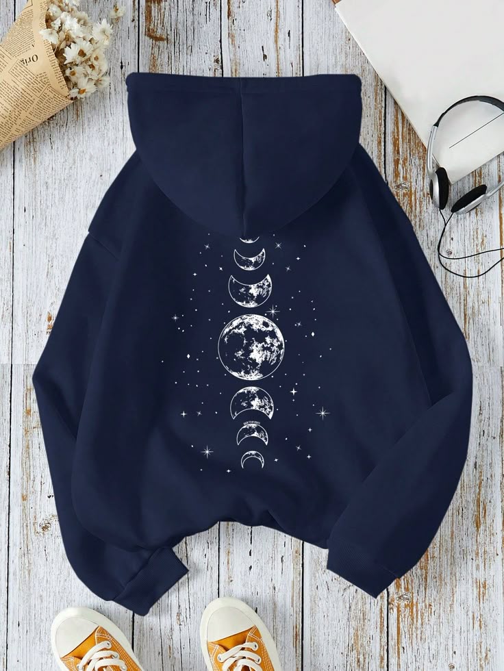 الرسمة المطبوعة على الظهر بتجمع بين النجوم والبدر ومراحله المختلفة، وكأنها لوحة سماوية مرسومة مخصوص عشان تذكرك إن التغيير جزء من الجمال.